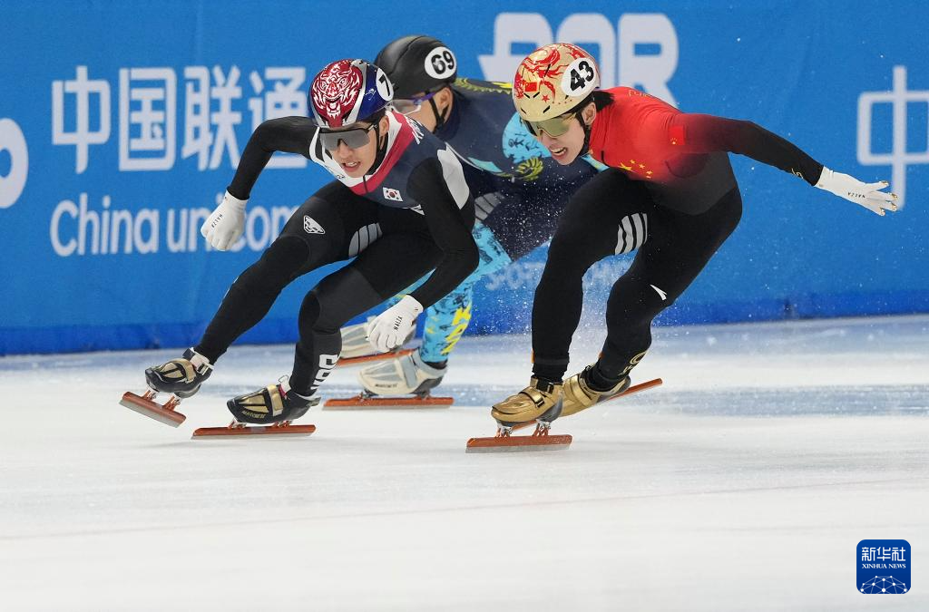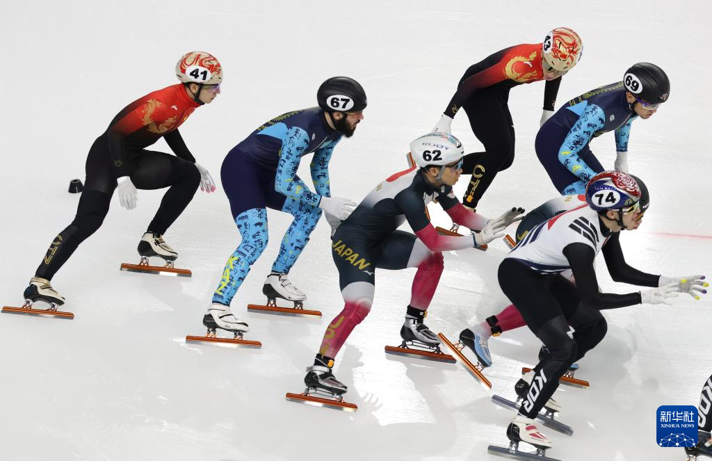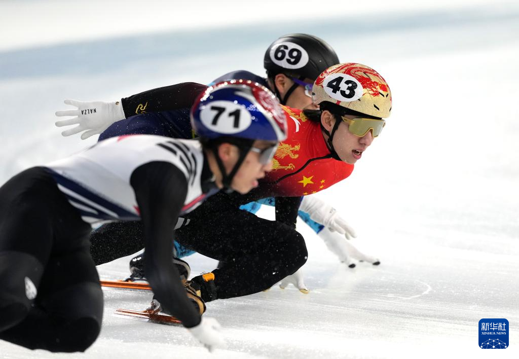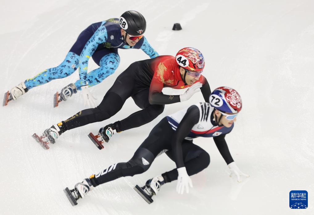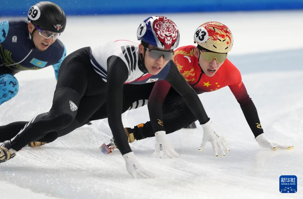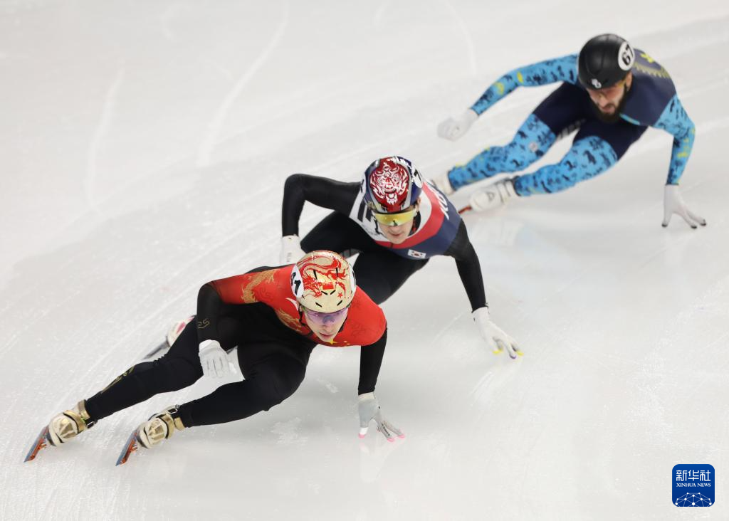 2月9日,中国队选手林孝埈(右)、韩国队选手朴智元(左)、哈萨克斯坦队选手阿迪勒·加利亚赫梅托夫在比赛中。
