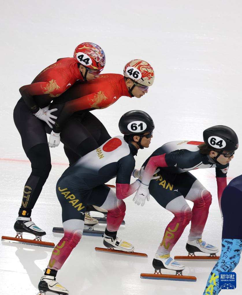 2月9日,中国队选手孙龙(左一)、刘少林(左二)在比赛中接力。
