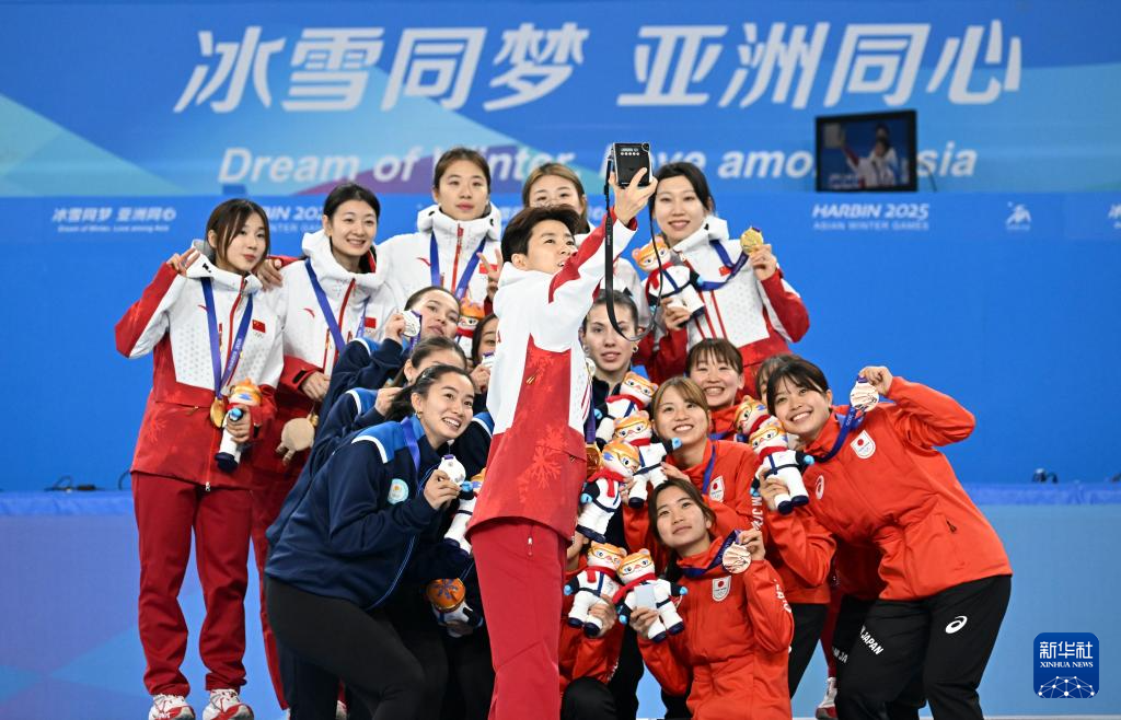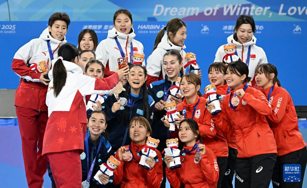 2月9日,冠军中国队(上)、亚军哈萨克斯坦队(下左)和季军日本队在颁奖仪式上合影。