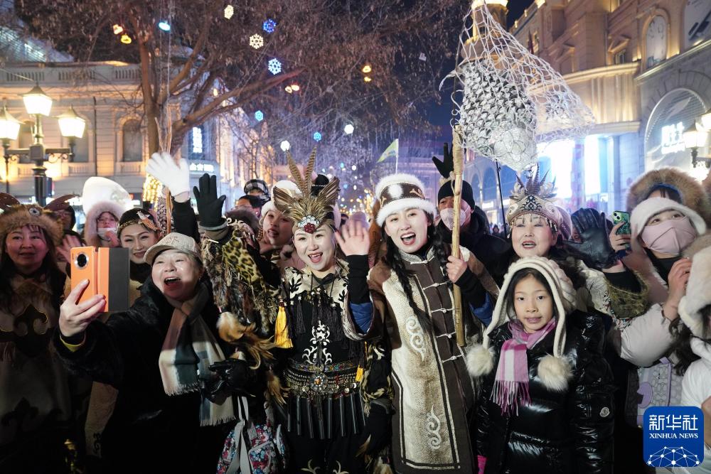 2024年1月6日,身着赫哲族服饰的赫哲族群众和饶河县文旅推荐官在哈尔滨中央大街与游客互动。新华社记者 王建威 摄
