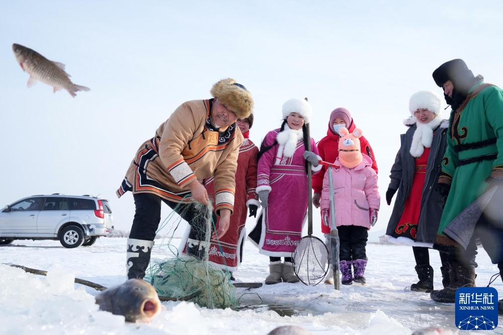 2023年1月11日,在黑龙江省抚远市东湖,赫哲族群众在进行冬捕。新华社记者 王建威 摄