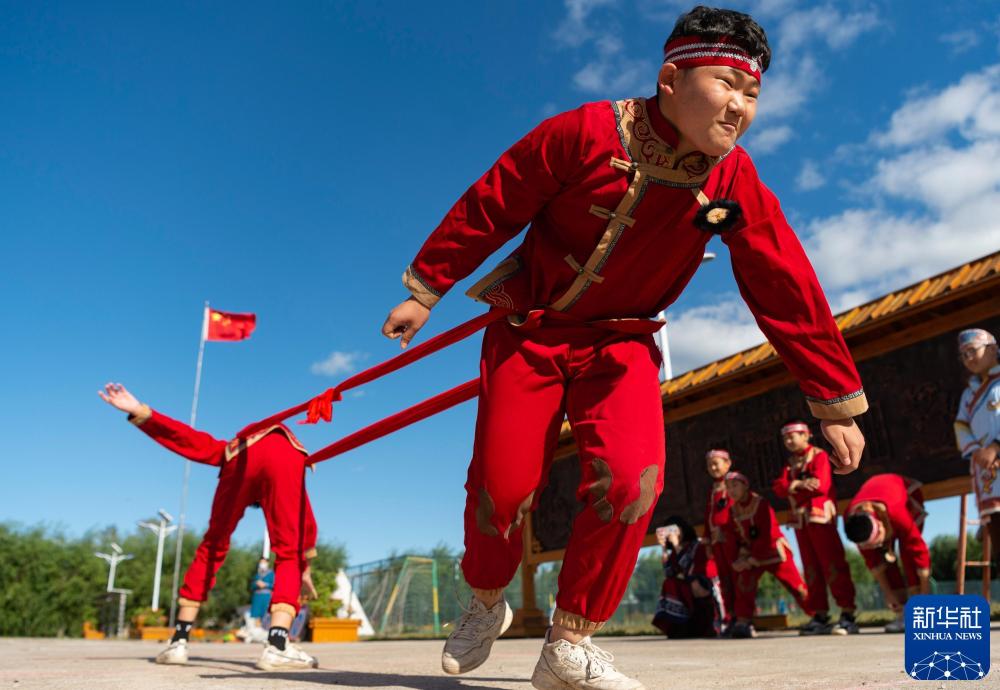 2020年9月11日,黑龙江省抚远市抓吉镇赫哲族学校的学生在体育课上进行“鱼王角力”活动。新华社记者 谢剑飞 摄