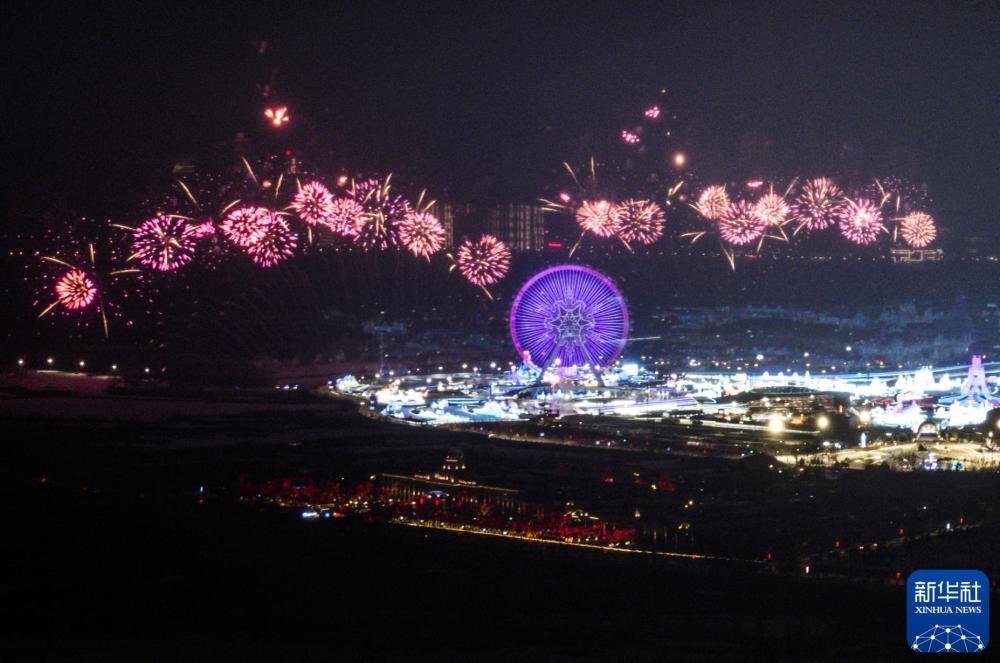 2025年2月7日,焰火在开幕式分会场上空绽放。当日,第九届亚洲冬季运动会开幕式在哈尔滨举行。新华社记者 孙非 摄