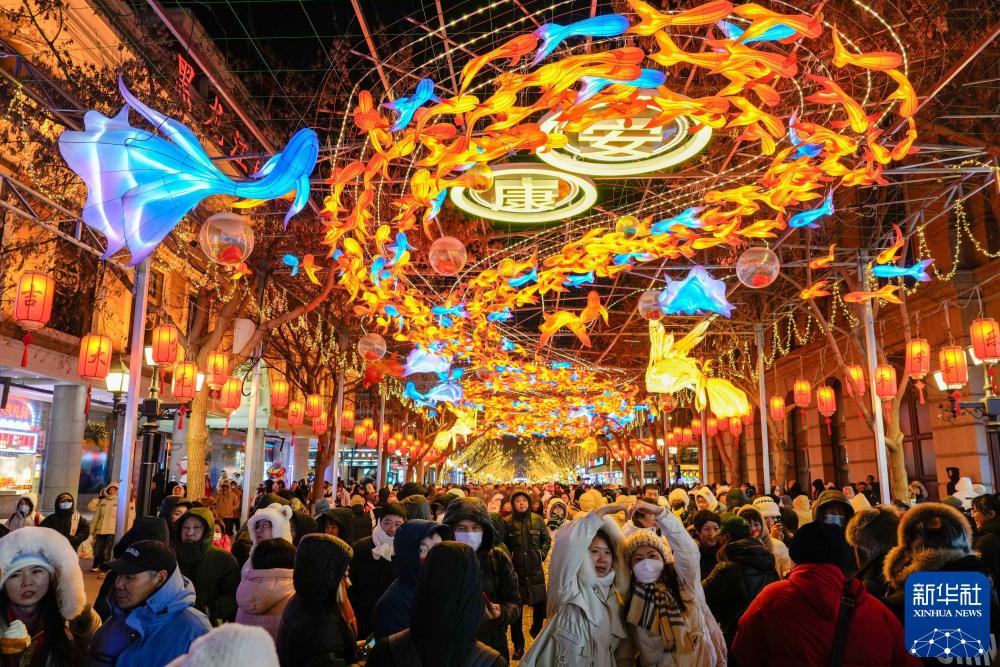 2025年1月30日,游客在哈尔滨中央大街上游玩、拍照。新华社记者 王建威 摄