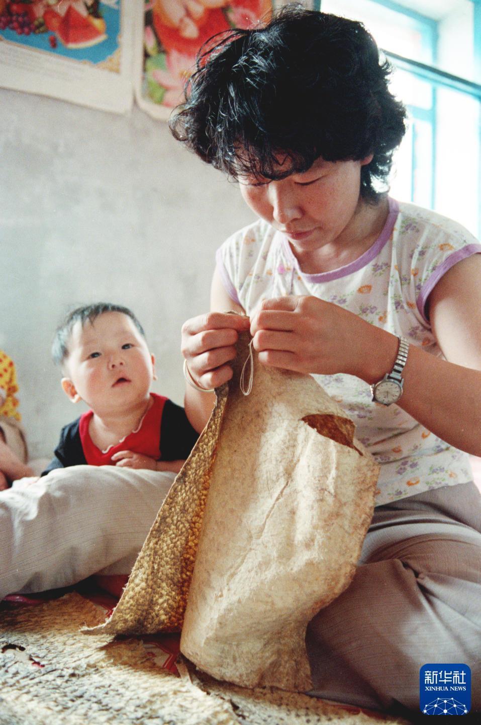 1988年,赫哲族女人精心缝制鱼皮衣服。新华社记者 刘向阳 摄