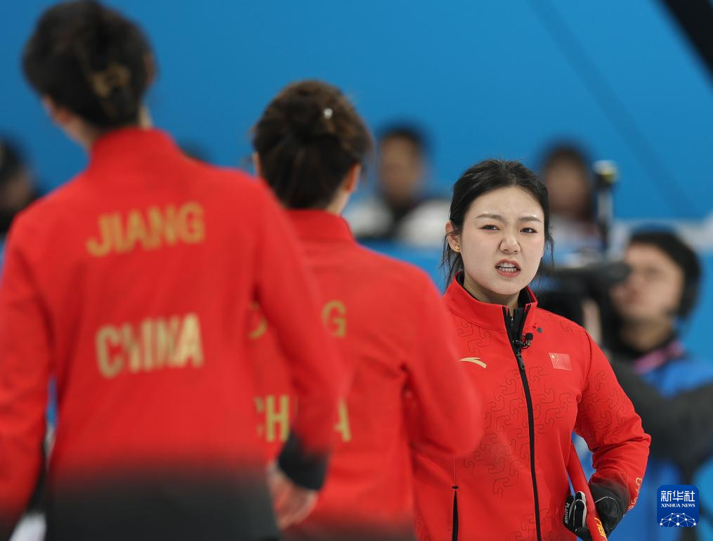 2月9日,中国队选手姜嘉怡(中)在比赛中掷壶。
