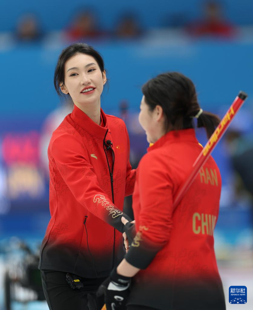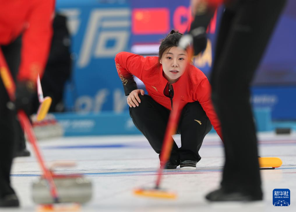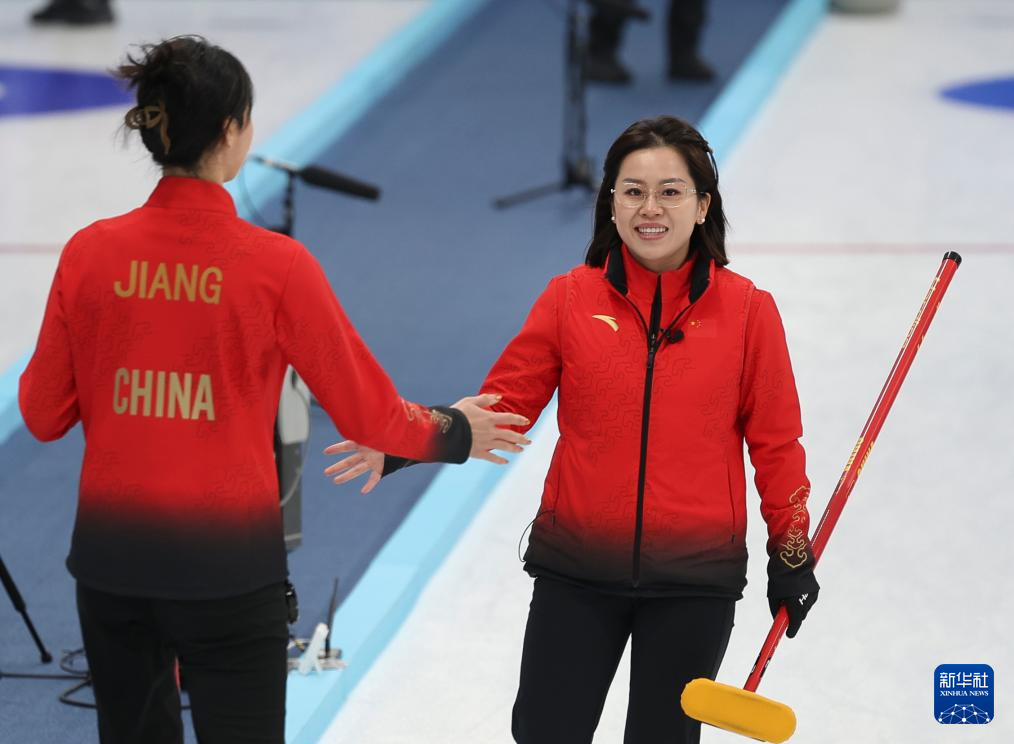 2月9日,中国队选手王芮(中)在比赛中掷壶。