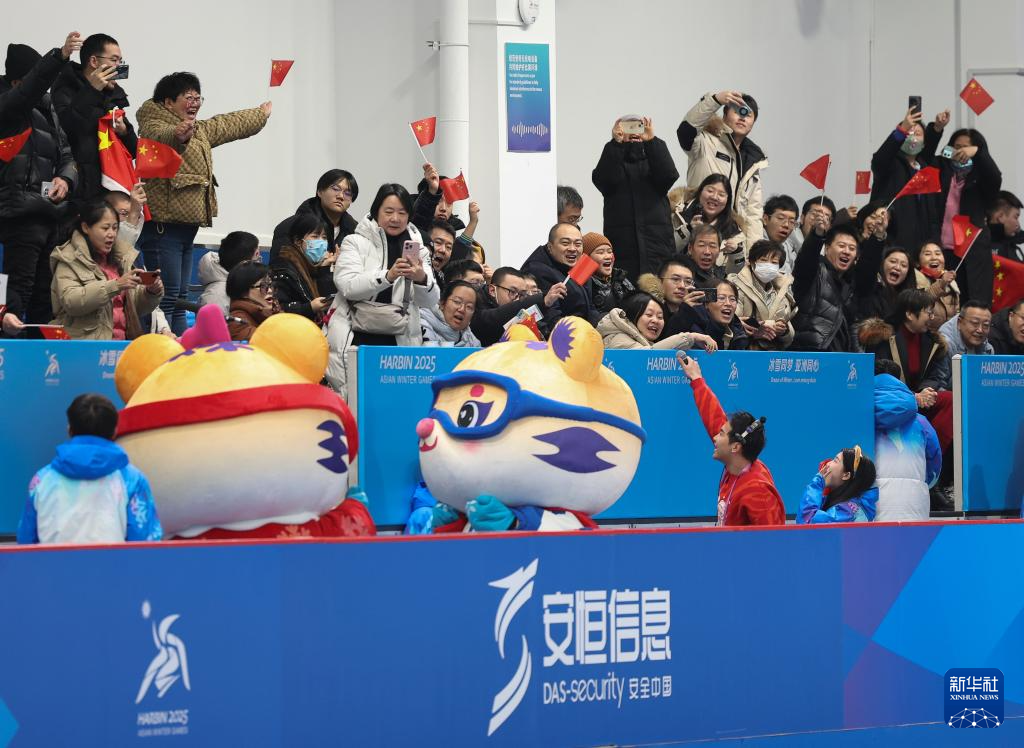 2月9日,亚冬会吉祥物“滨滨”、“妮妮”在赛前和观众互动。