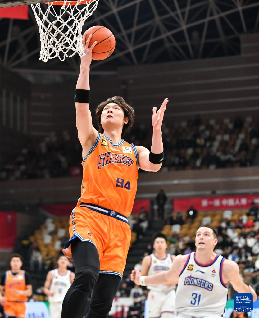 2月10日,上海久事队球员王哲林在比赛中上篮。