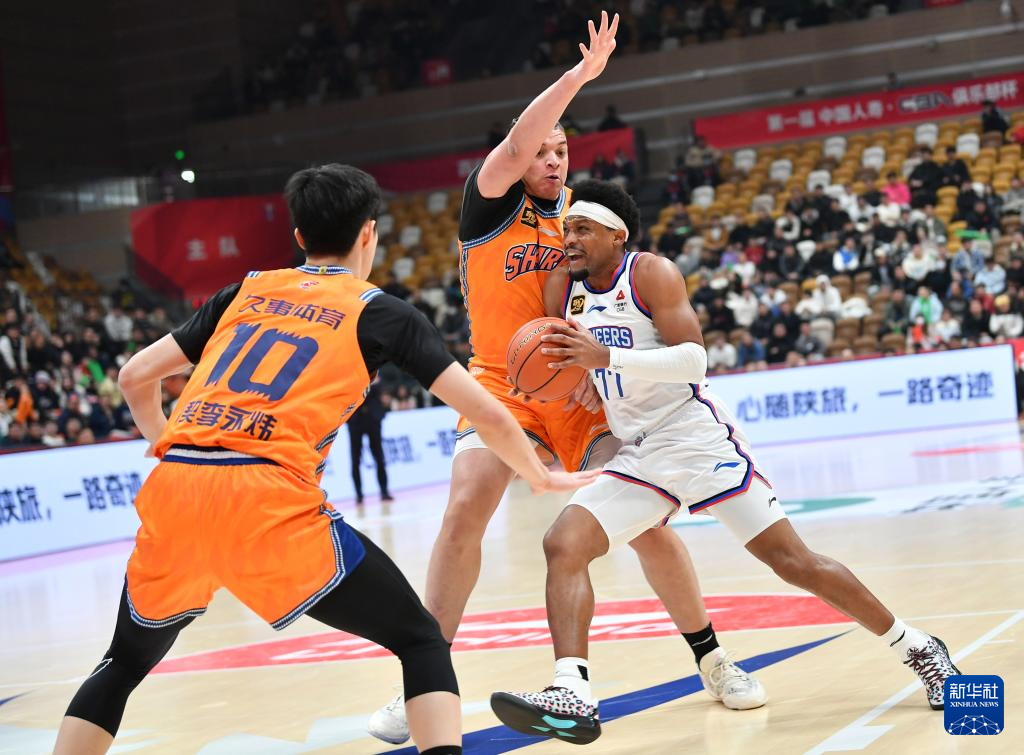 2月10日,上海久事队球员洛夫顿(中)在比赛中进攻。