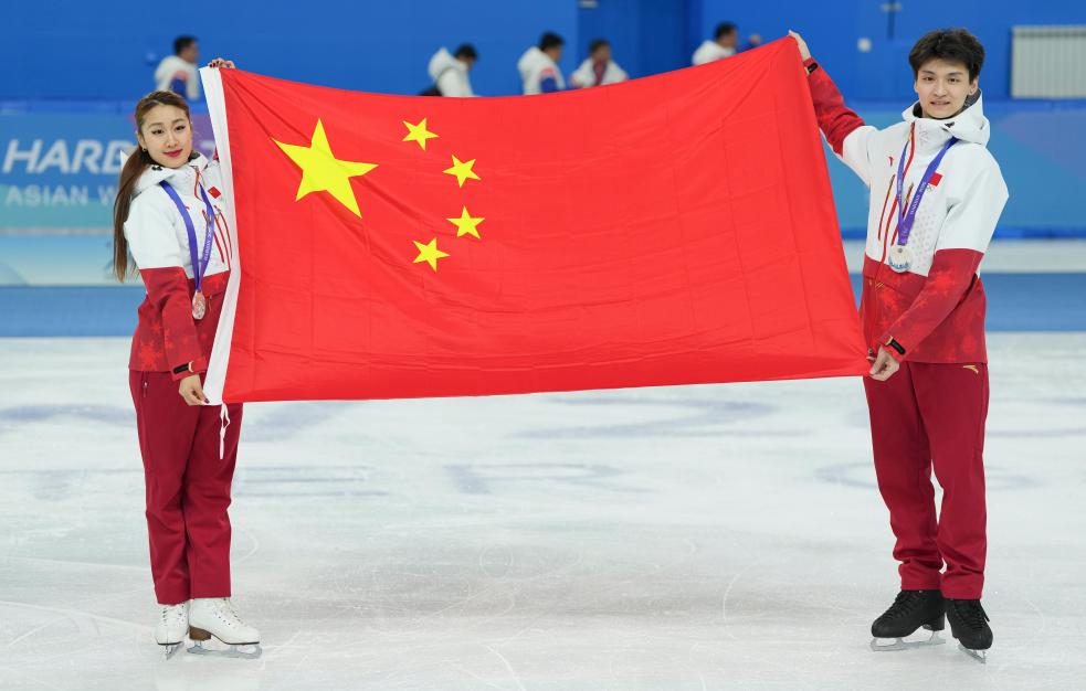 2月12日,亚军中国组合任俊霏(左)/邢珈宁与国旗合影。新华社记者 王建威 摄
