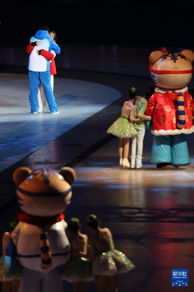 2月14日,吉祥物“滨滨”“妮妮”在闭幕式上。