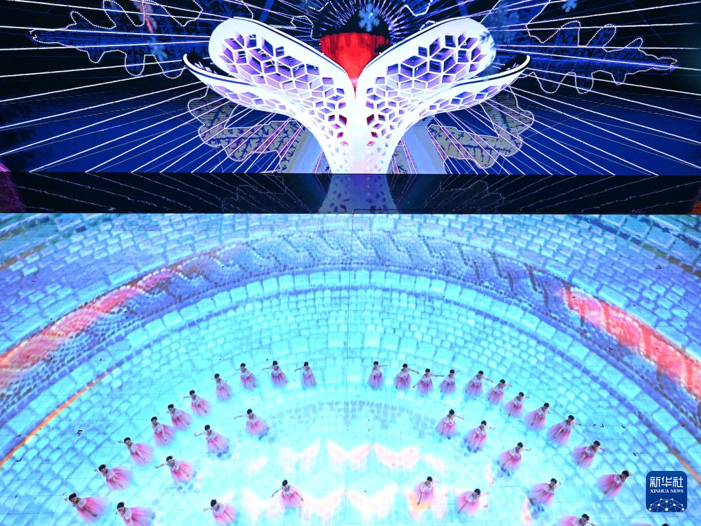 2月14日,闭幕式的屏幕上展示新华社记者拍摄的照片。