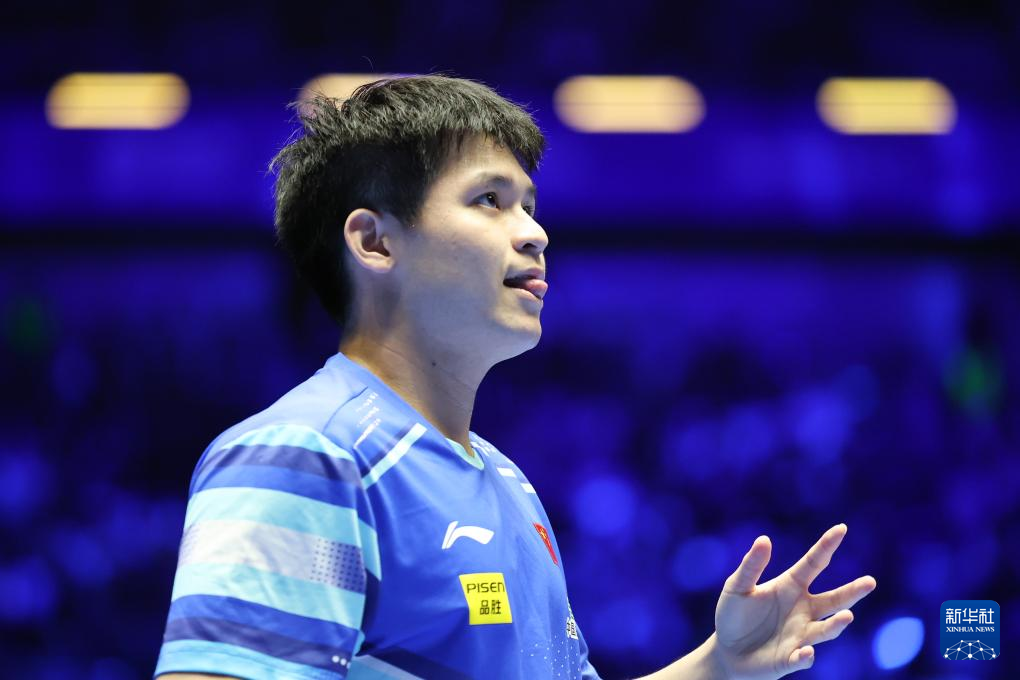 2月19日,林诗栋在比赛中庆祝得分。新华社记者 梁旭 摄