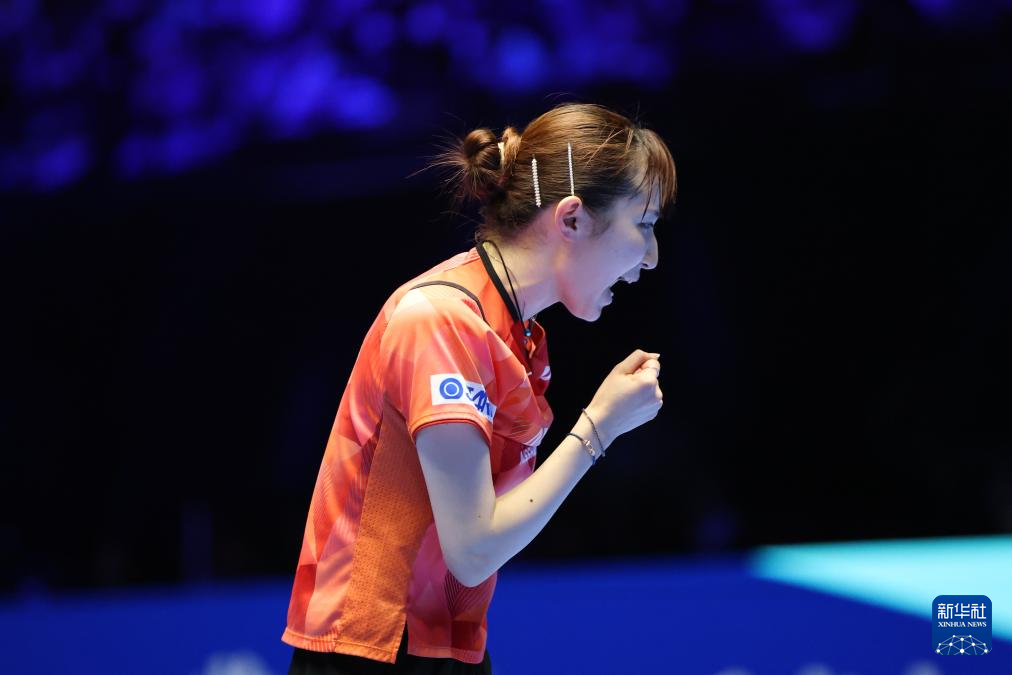 2月19日,早田希娜在比赛中庆祝得分。