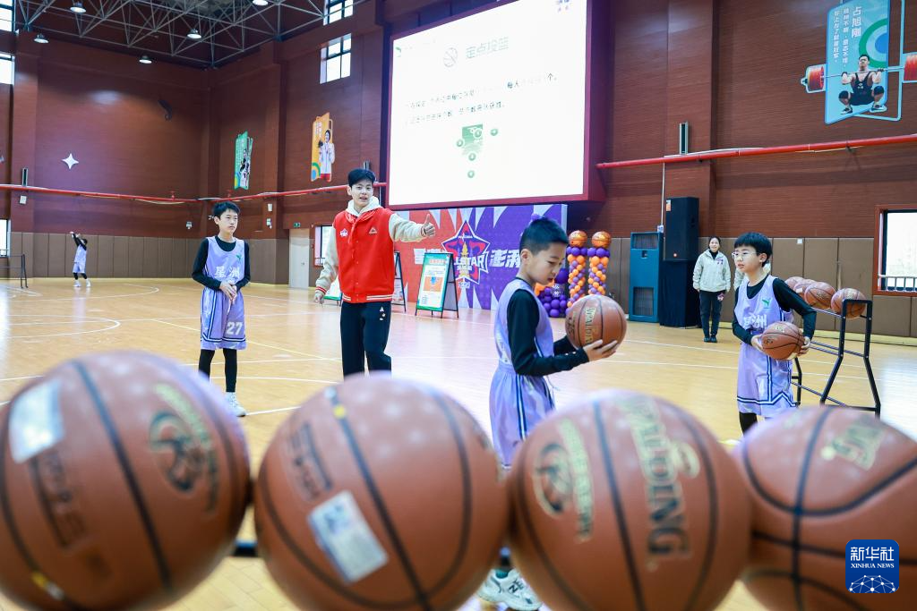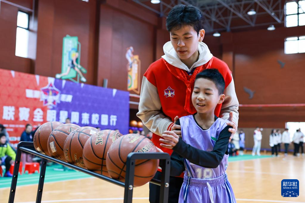 2月22日,来自东莞新彤盛队的WCBA全明星正赛球员杨舒予(左二)在活动现场指导杭州市星洲小学的学生投篮。