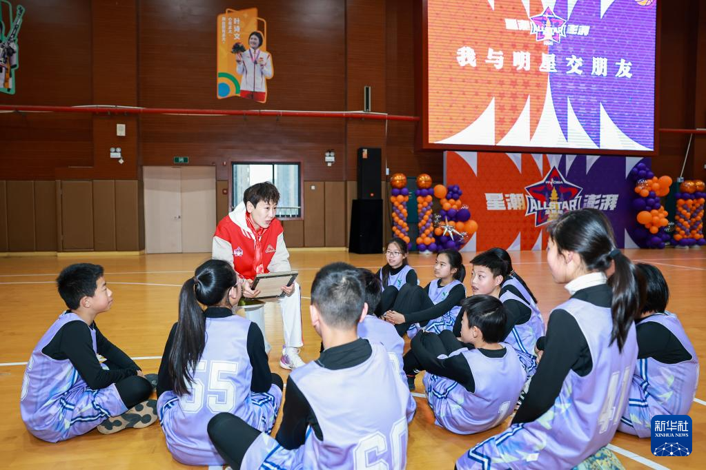 2月22日,来自内蒙古农信队的WCBA全明星正赛球员李缘(左)在活动现场与杭州市星洲小学的学生互动。