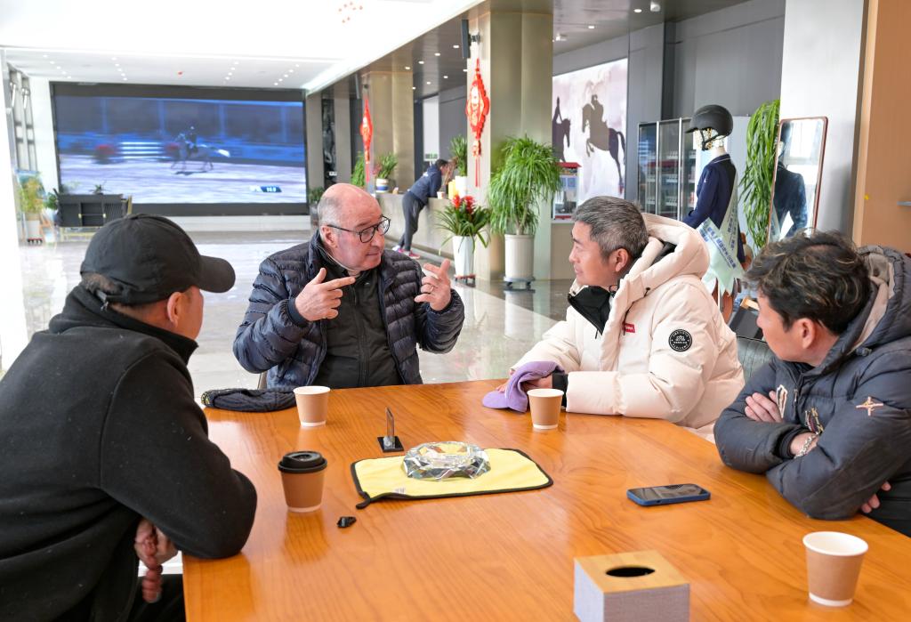 图为勒热纳在和马术队队员交流经验。新华社记者 冯开华 摄