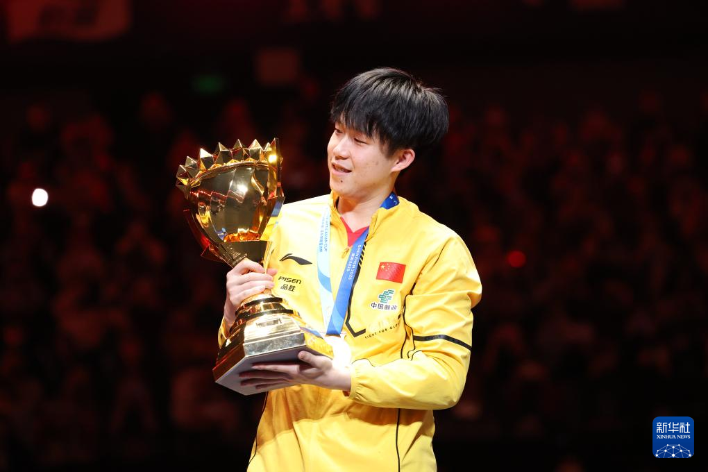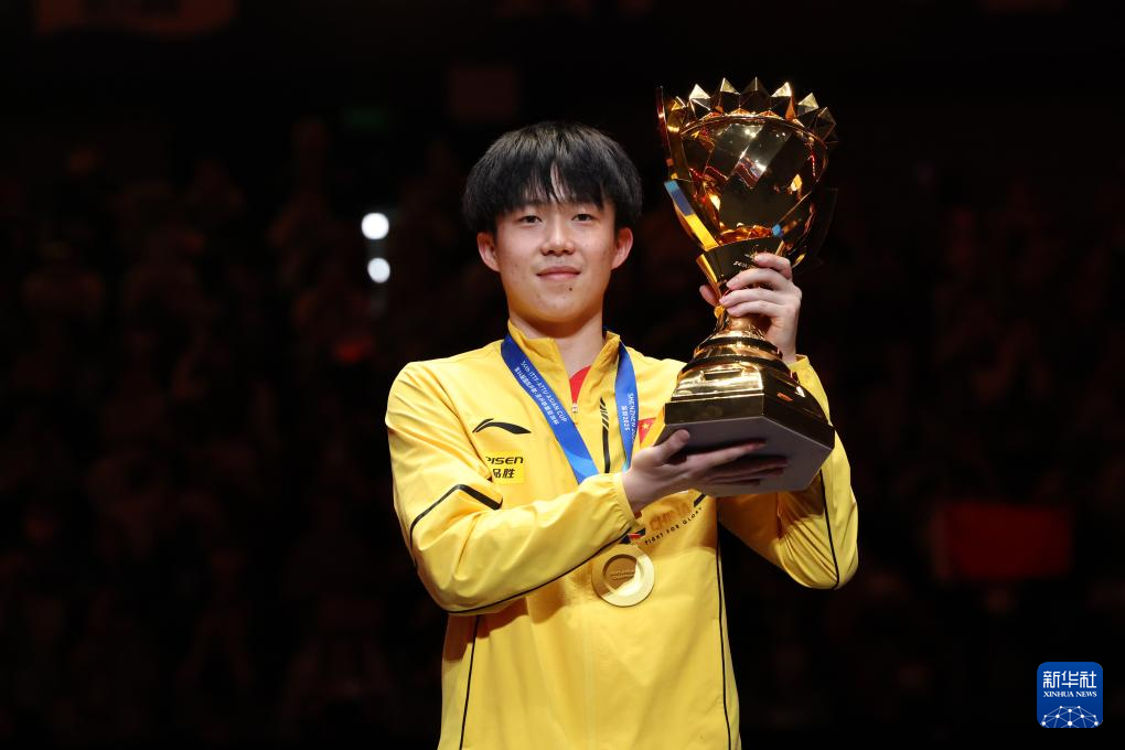 2月23日,王楚钦在颁奖仪式上捧杯。