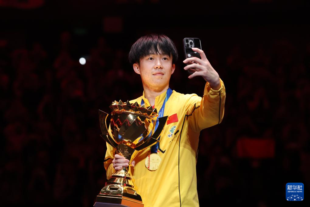2月23日,王楚钦在颁奖仪式上自拍。