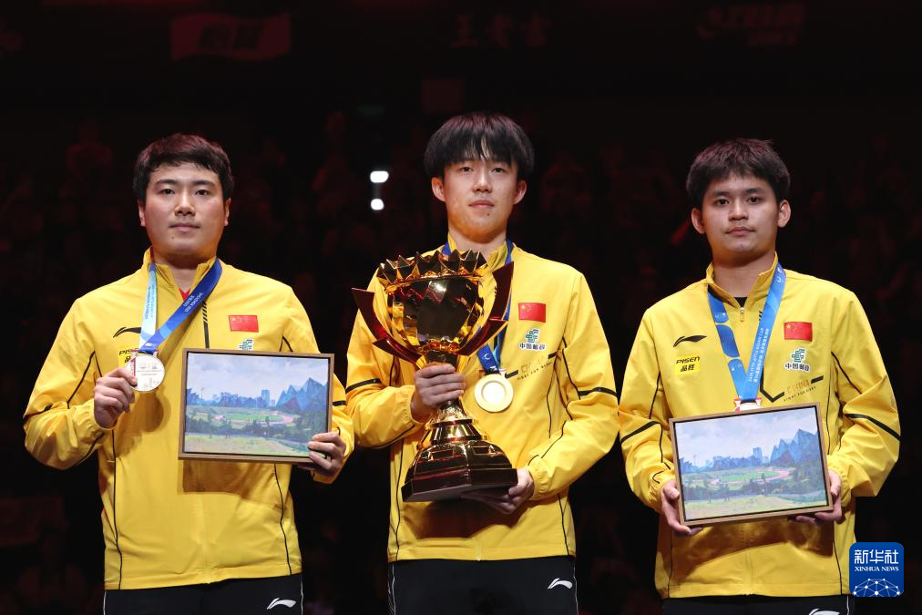 2月23日,冠军王楚钦(中)、亚军梁靖崑(左)和季军林诗栋在颁奖仪式上合影。