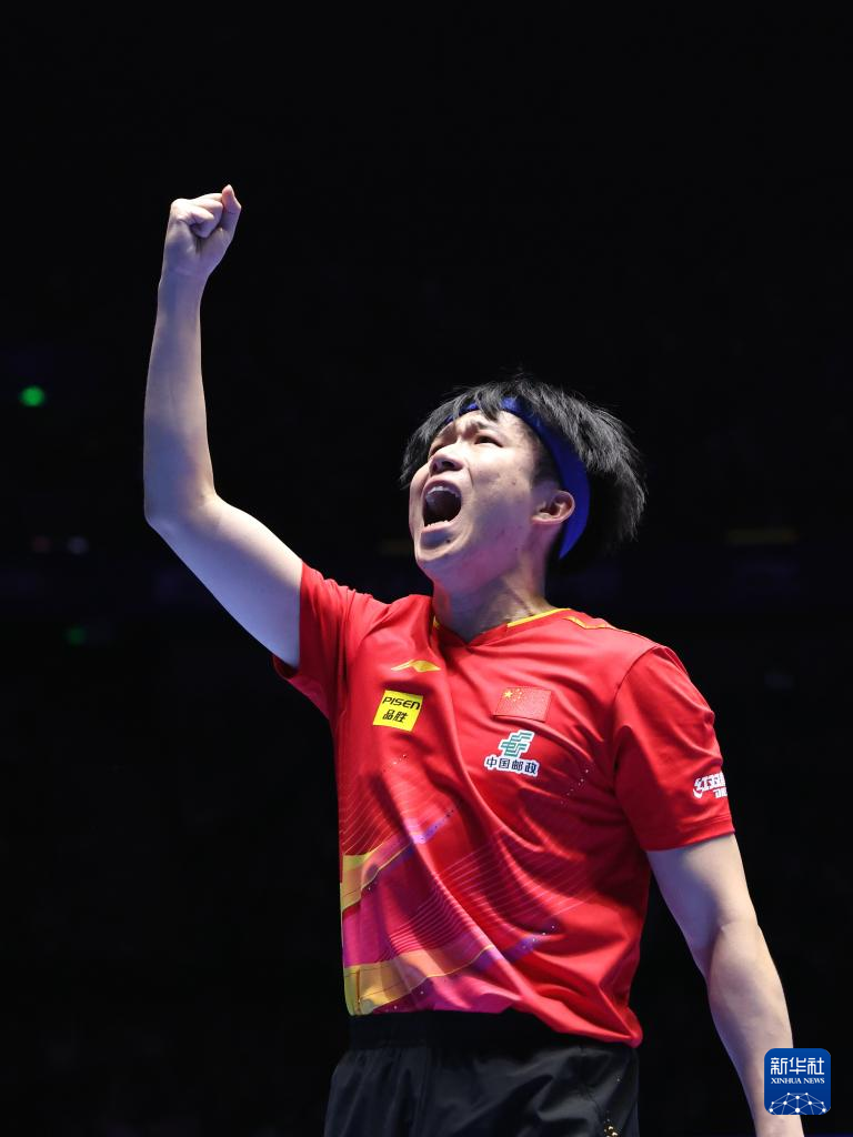 2月23日,王楚钦在获胜后庆祝。