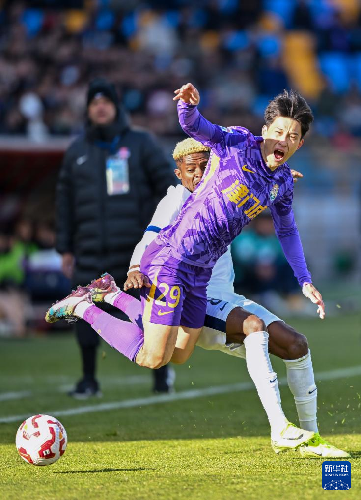 2月23日,天津津门虎队球员杨帆(左)防守梅州客家队球员恩戈姆。