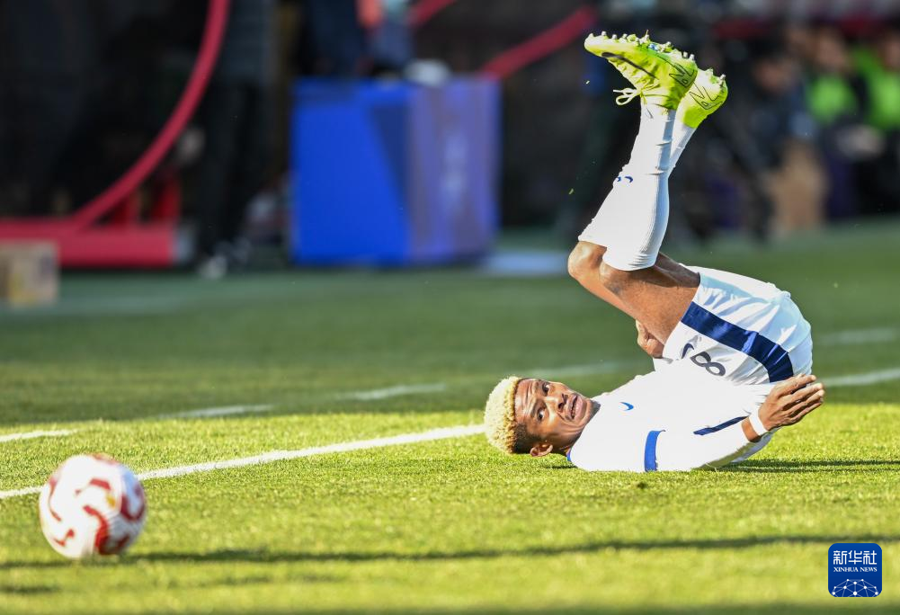 2月23日,梅州客家队球员恩戈姆在比赛中拼抢倒地。