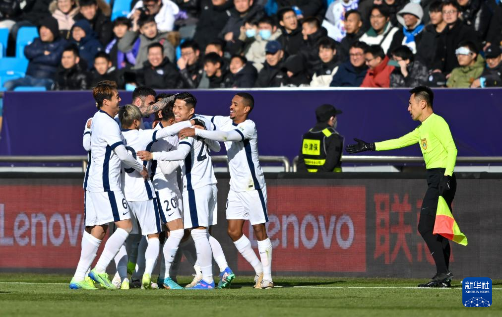2月23日,天津津门虎队球员基莱斯(右三)庆祝为球队扳平比分。