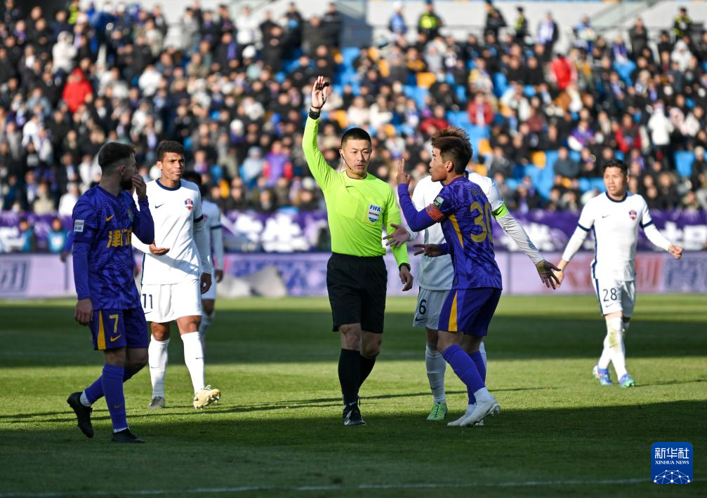 2月23日,主裁判傅明(左三)在比赛中判罚任意球。