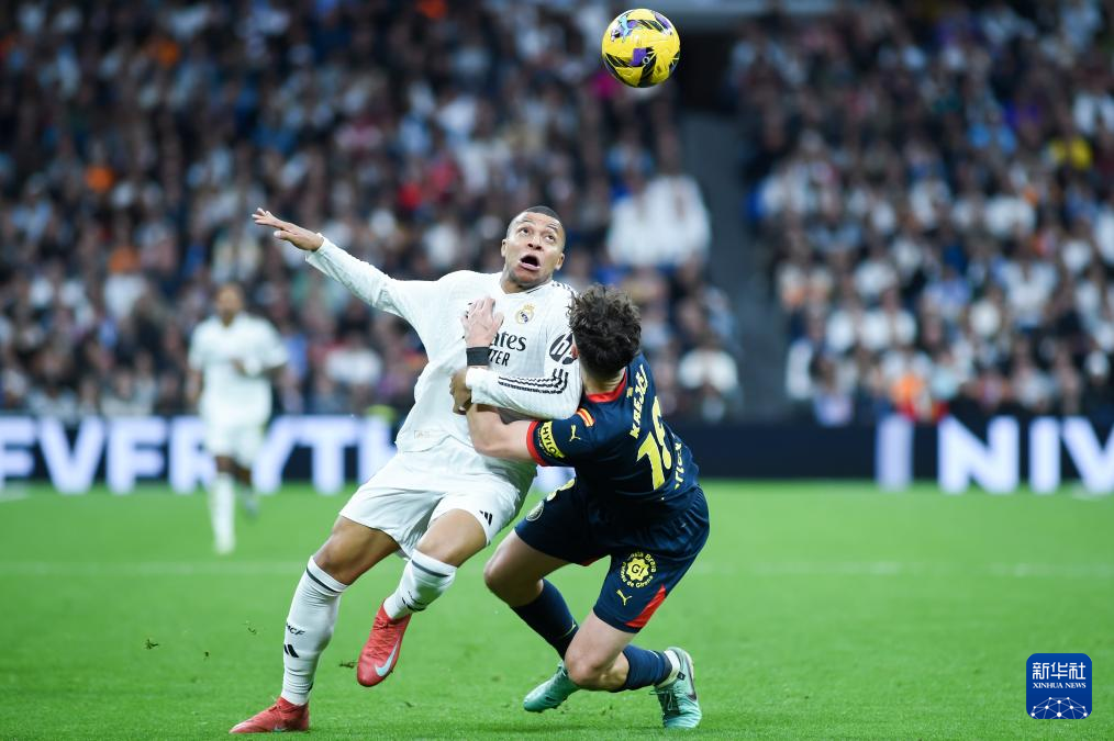 2月23日,皇家马德里队球员姆巴佩(右)和赫罗纳队球员伊万·马丁在比赛中拼抢。