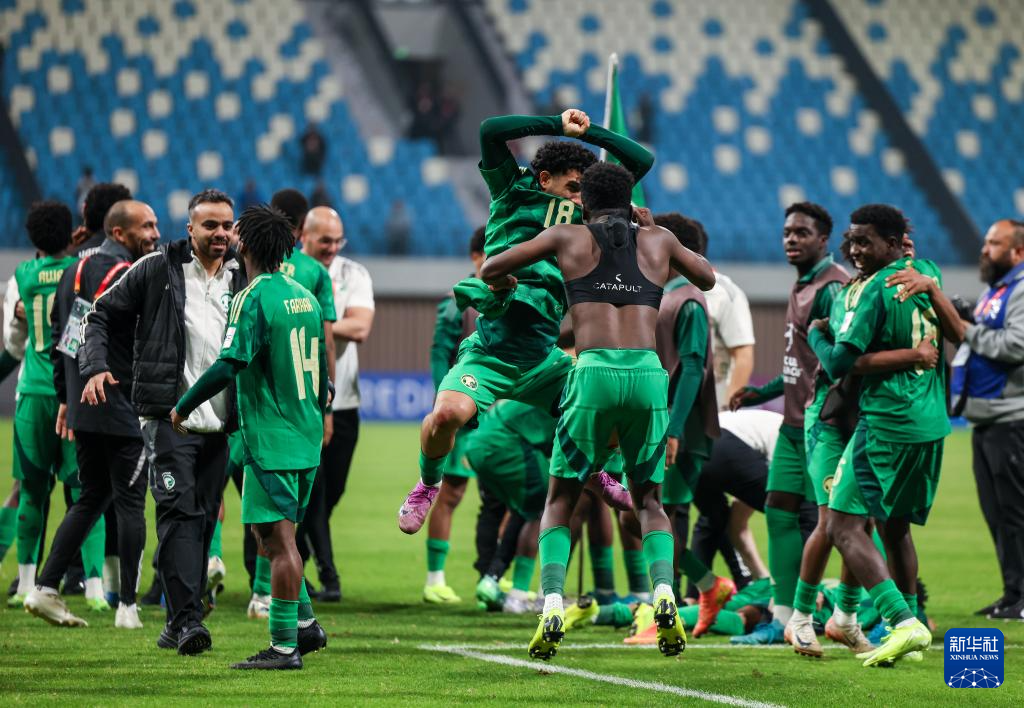2月26日,沙特阿拉伯队球员赛后庆祝胜利。