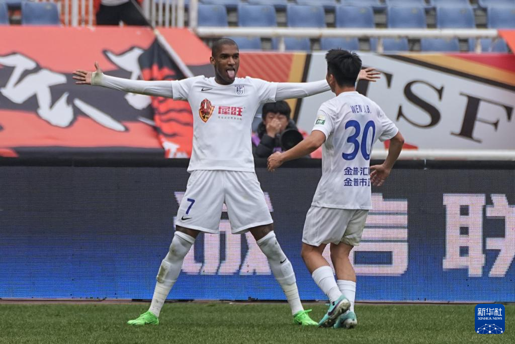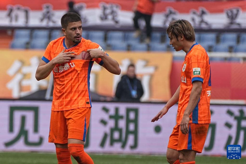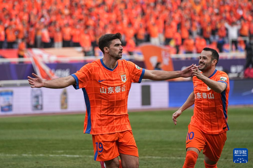 2月28日,山东泰山队球员泽卡(左)在比赛中庆祝进球。