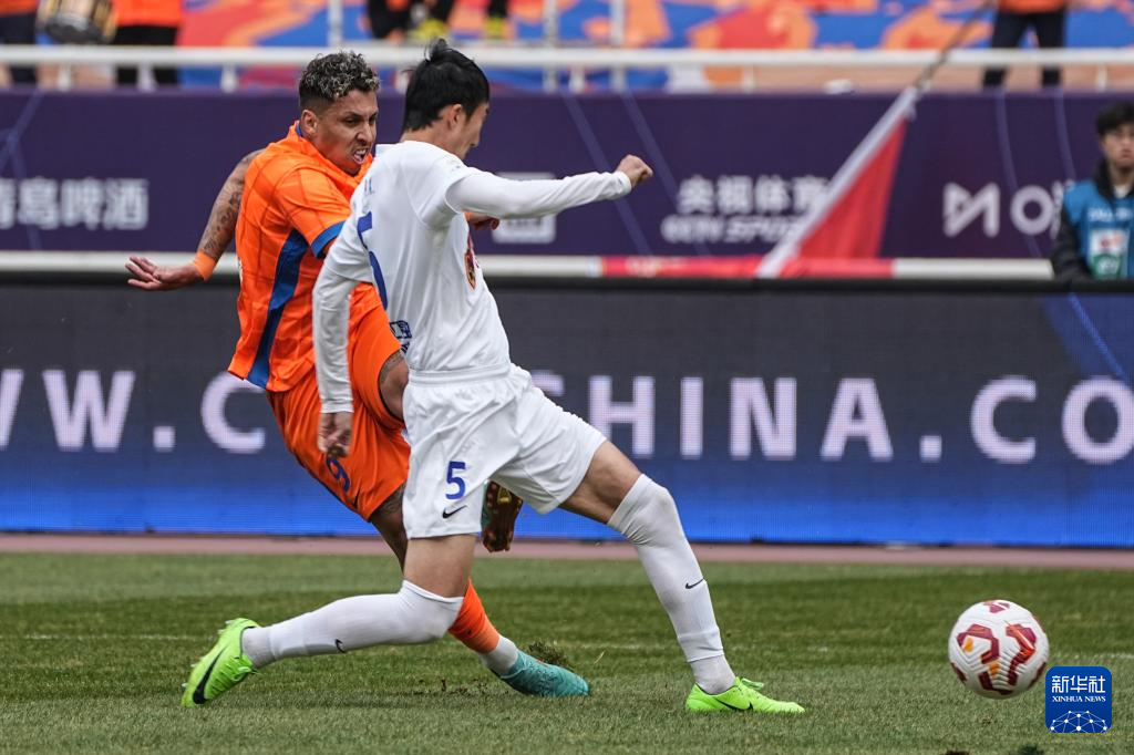 2月28日,山东泰山队球员吴兴涵(左)在比赛中突破。