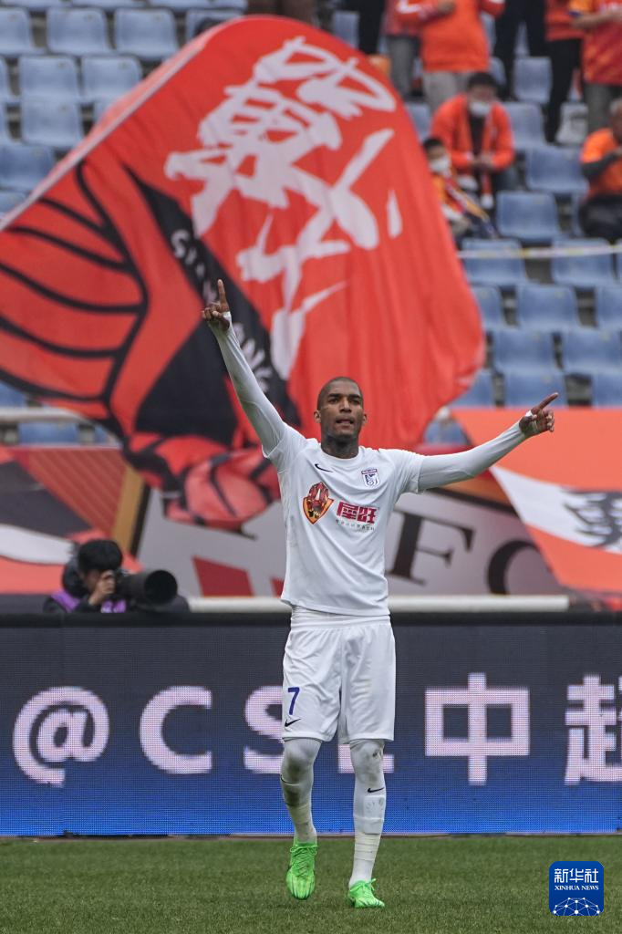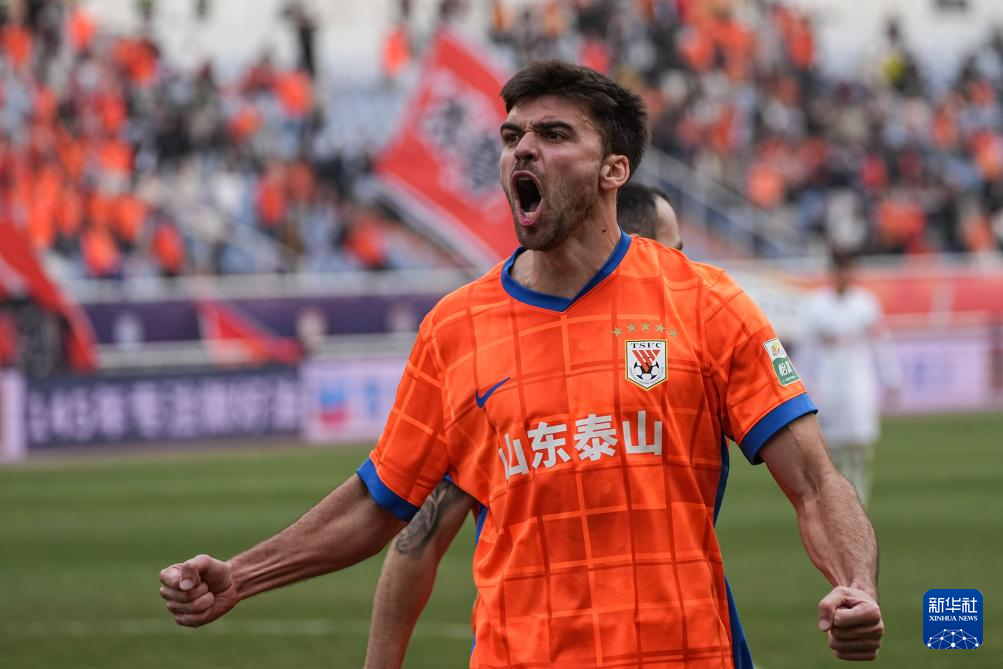 2月28日,山东泰山队球员泽卡在比赛中庆祝进球。