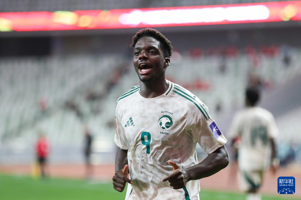 3月1日,沙特阿拉伯队球员塔拉勒·哈吉庆祝进球。