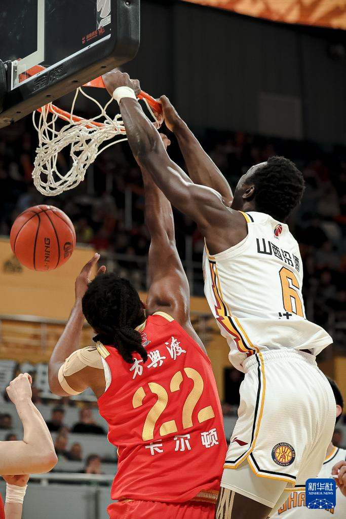 3月5日,山西汾酒队球员法耶(右)在比赛中扣篮。