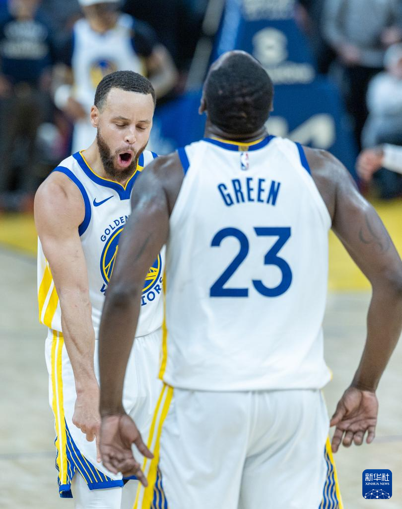 3月8日,勇士队球员库里(左)与队友格林庆祝得分。