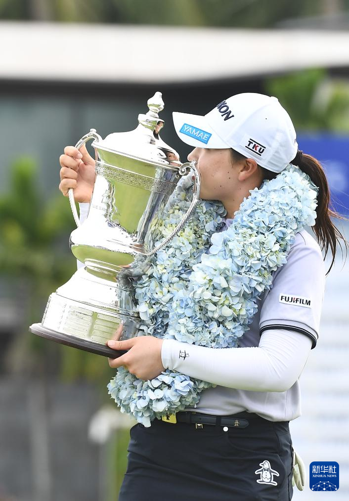 3月9日,日本选手竹田丽央在颁奖仪式上亲吻奖杯。她以271杆、低于标准杆17杆的总成绩获得冠军。