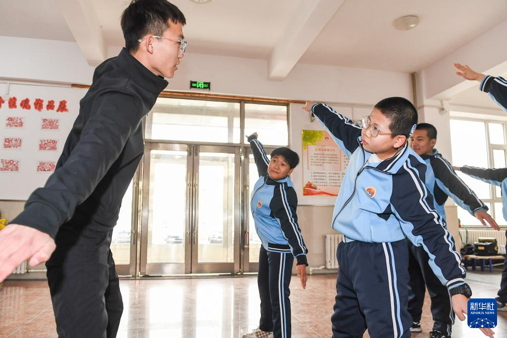3月12日,四平市聋哑学校体育老师刘金鹏(左一)帮助学生练习课间操。