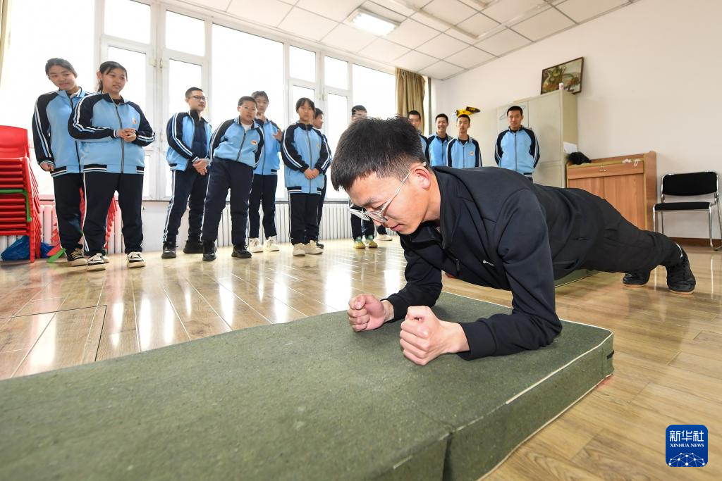 3月12日,四平市聋哑学校体育老师刘金鹏(前)为学生示范平板支撑。
