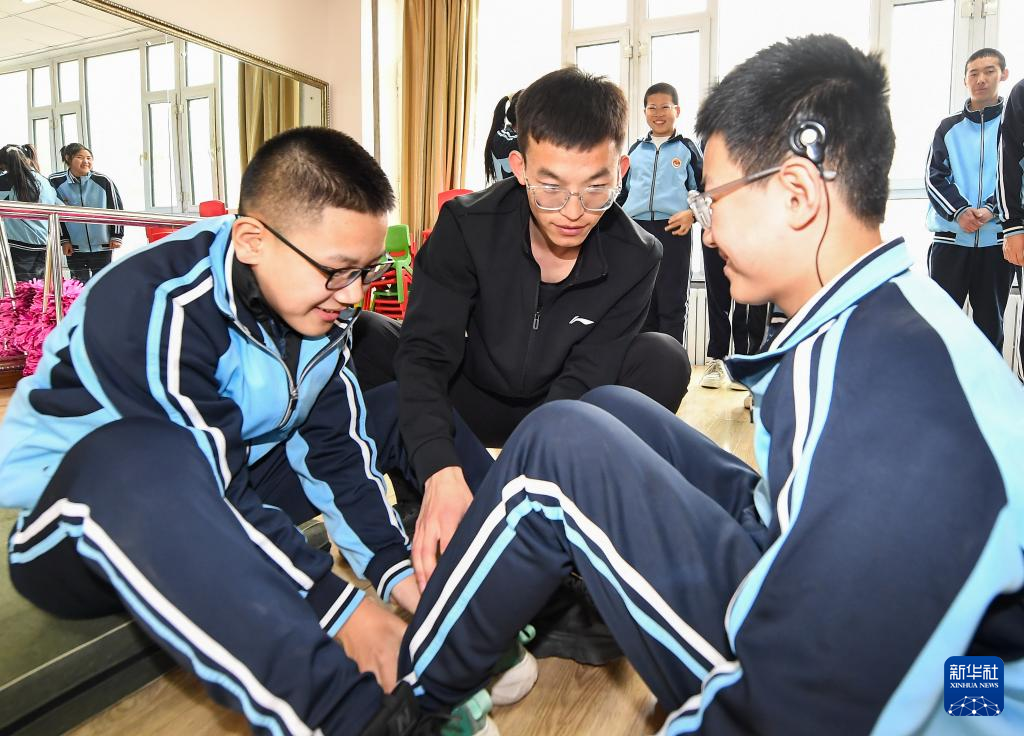 3月12日,四平市聋哑学校体育老师刘金鹏(前中)帮助学生练习仰卧起坐。