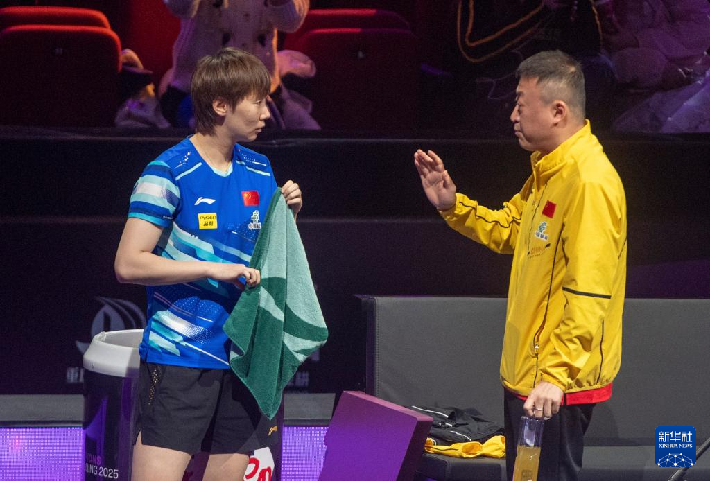 3月12日,教练马琳(右)在比赛间隙和王曼昱交流。