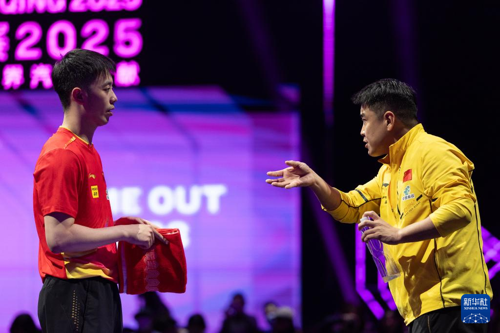 3月12日,教练王皓(右)在比赛间隙指导陈垣宇。