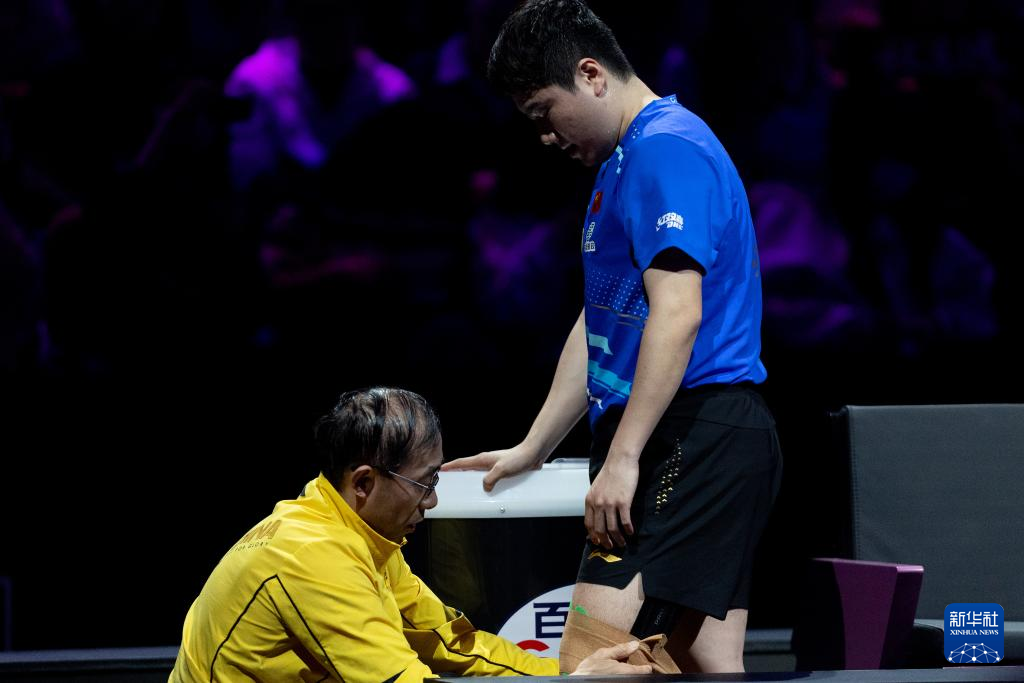3月14日,梁靖崑(右)在比赛间隙治疗腿伤。