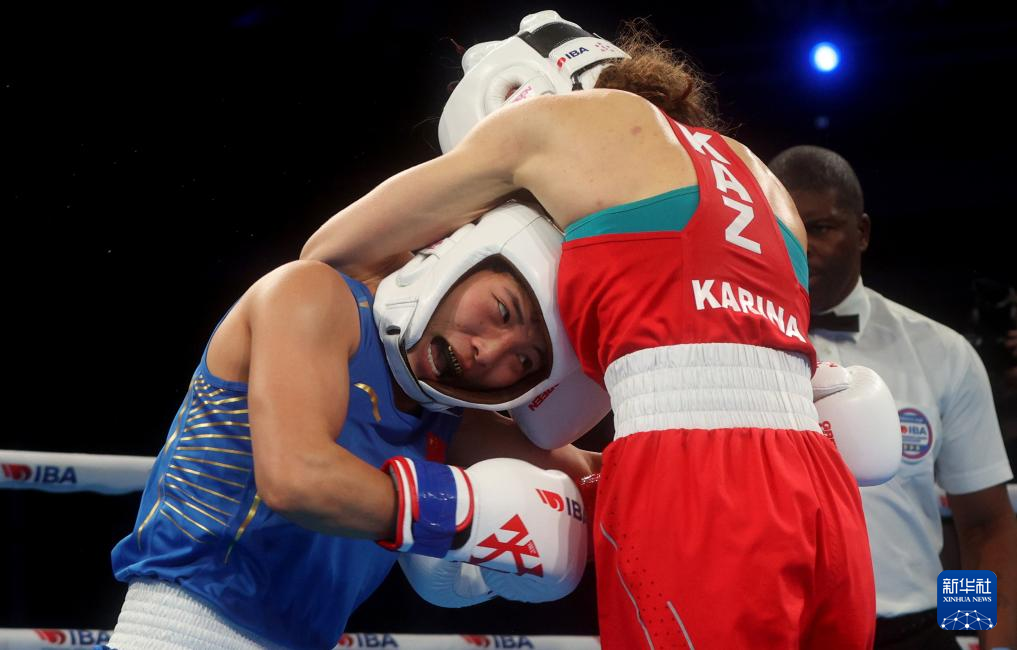 3月13日,中国选手蔡妍(左)与哈萨克斯坦选手易卜拉欣莫娃在54-57公斤级四分之一决赛中。最终,蔡妍战胜易卜拉欣莫娃,晋级半决赛。