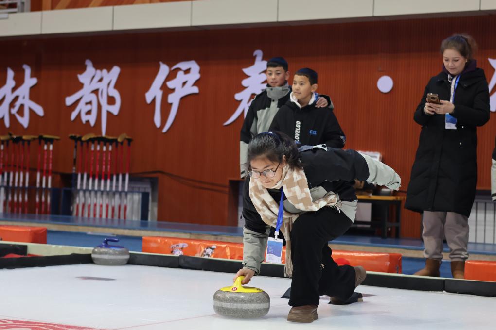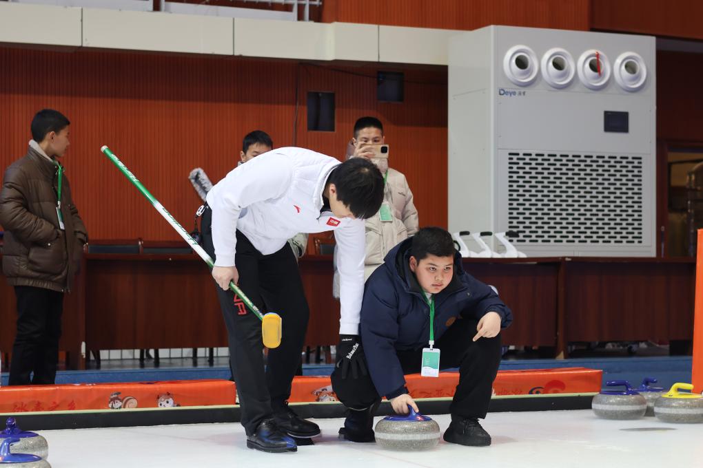 阿卜杜热合曼(右一)在教练的指导下体验投掷冰壶。