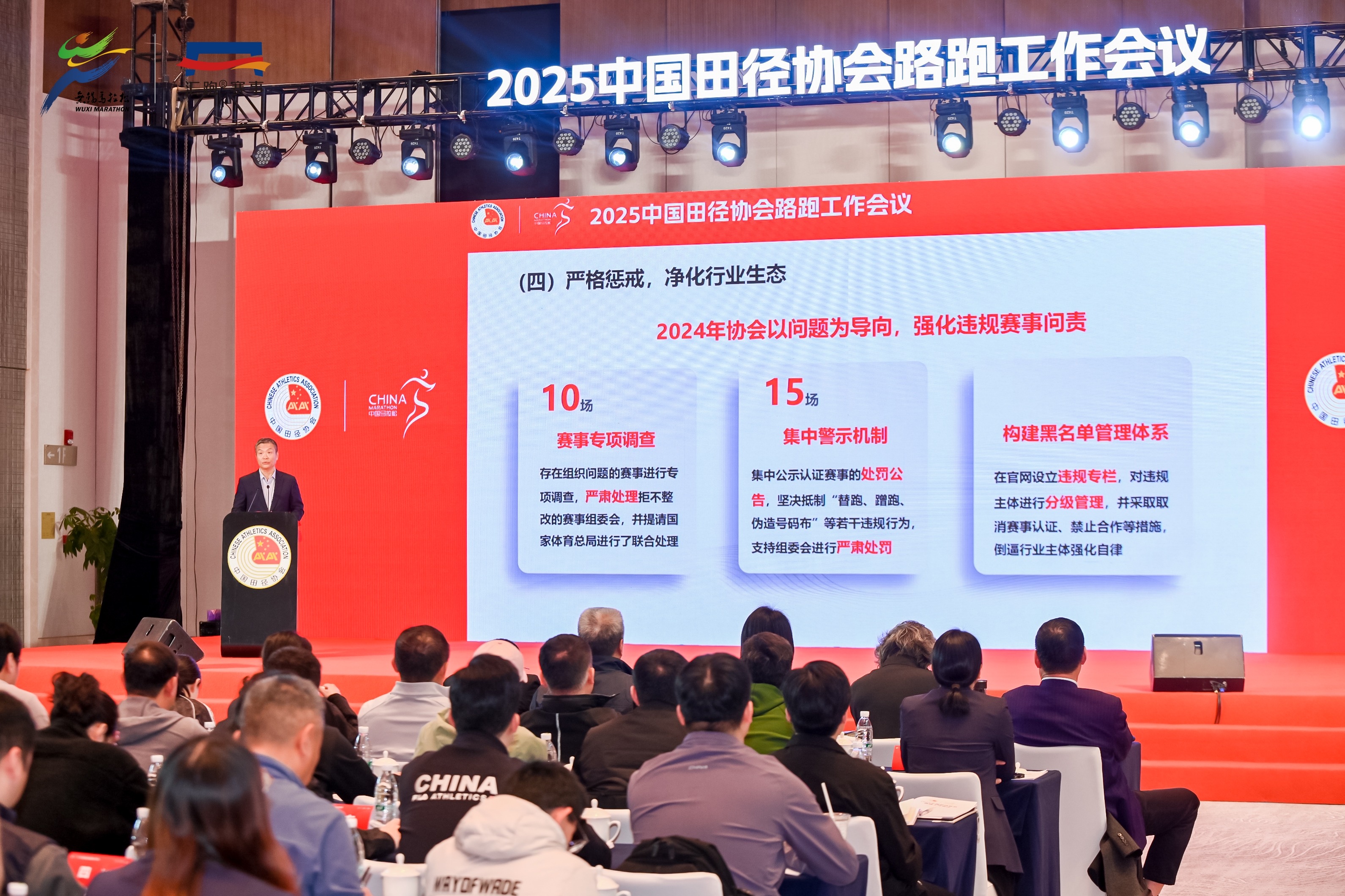 3月21日,在2025中国路跑工作会议中,国家体育总局田径运动管理中心、中国田径协会联合党委书记,中国田径协会副主席孙远富作《2024年中国路跑工作报告》。图片来源:中国田径协会
