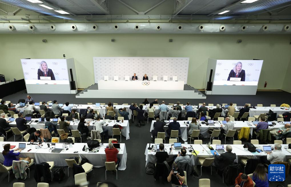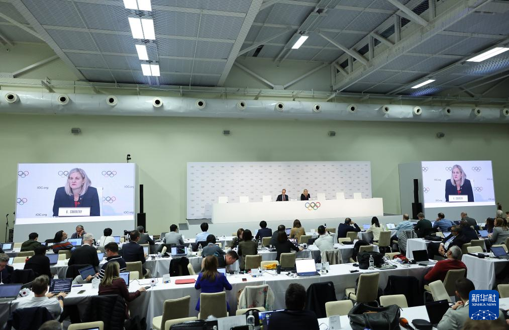 3月20日,国际奥委会新当选主席考文垂(上右)在发布会上。