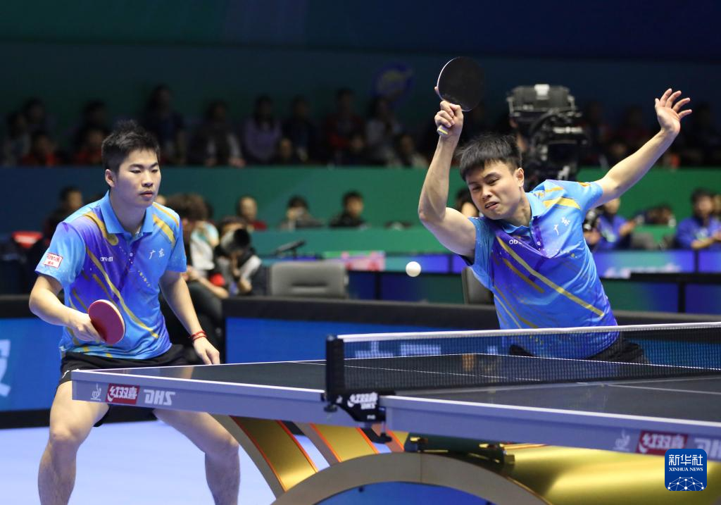 3月23日,广东队组合周启豪(右)/袁烜松在比赛中回球。他们0比3不敌北京八喜队组合马龙/黄友政。